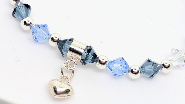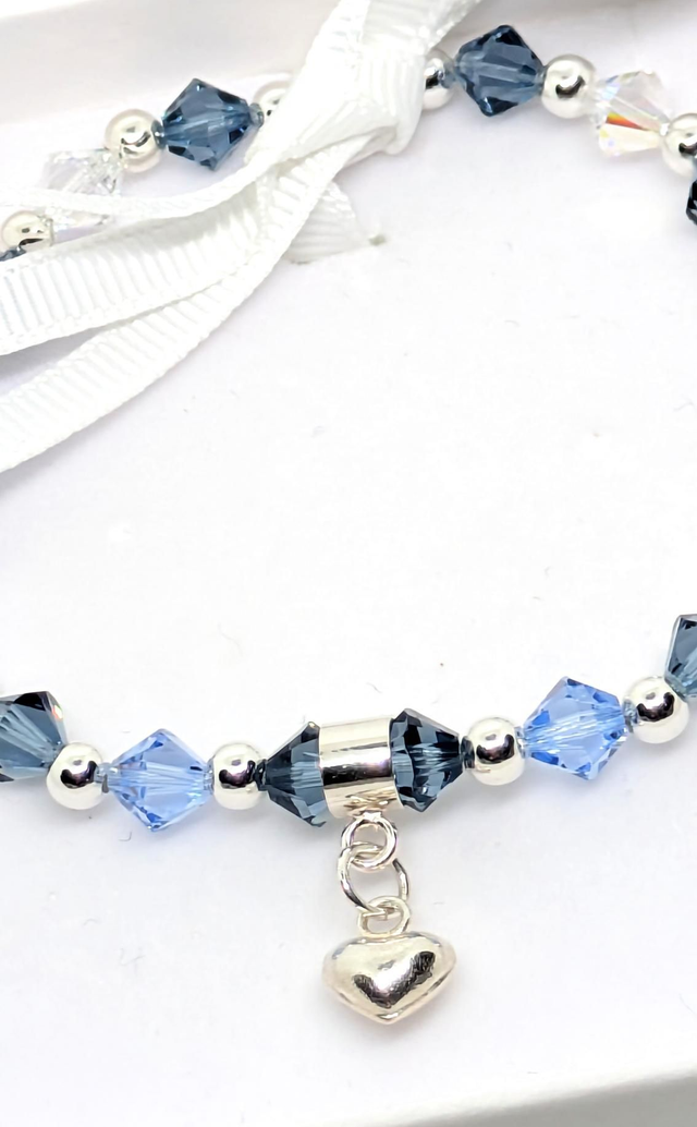 A Beautiful Crystal Bracelet made with Blue & Clear Serenity Crystal Beads and a 925 Sterling Silver Puffed Heart Charm.