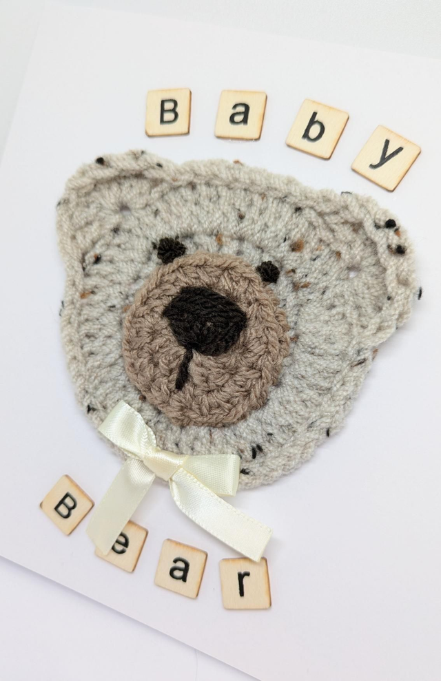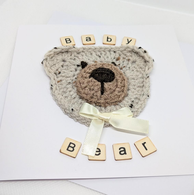Gorgeous Handmade New Born 'Baby Bear' Greeting Card, Featuring A Crocheted Teddy Bear Face And The Words 'Baby Bear' With Small Wooden Tiles.